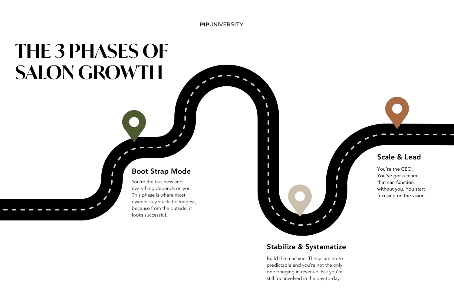 So let’s make it simple. Here are the 3 phases of salon growth we walk our students through and the shifts you need to make in each one.
