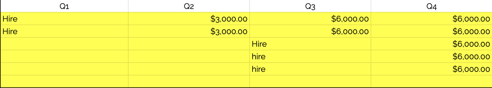 On the spreadsheet, there’s a chart for up to 6 new hires, if you want to hire more, add rows and if you want to hire less, you can hide the rows. You’re going to type the word “Hire” in for the quarters you want to hire each person in. We recommend hiring in clusters of at least 2 at a time because there are many benefits to this.